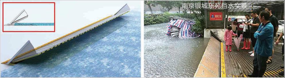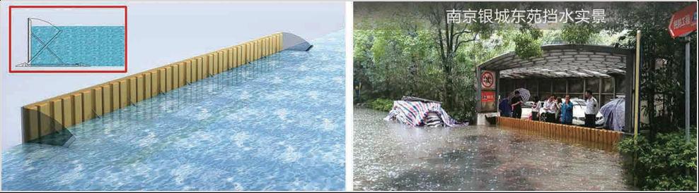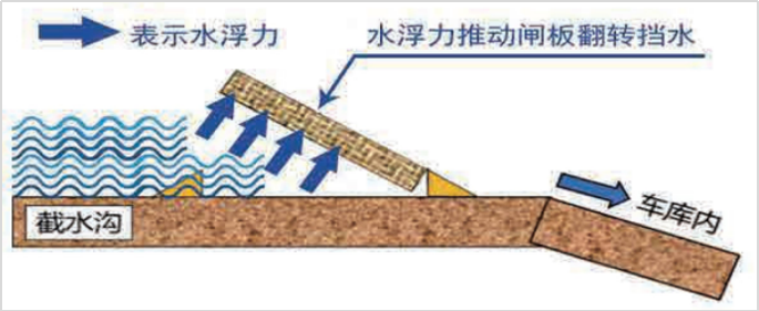 當洪水來襲時,由于擋水板正義密度小于水,擋水板在迎面洪水浮力作用下,自動翻轉成直立狀態而擋住洪水。擋水過程無需電力驅動。